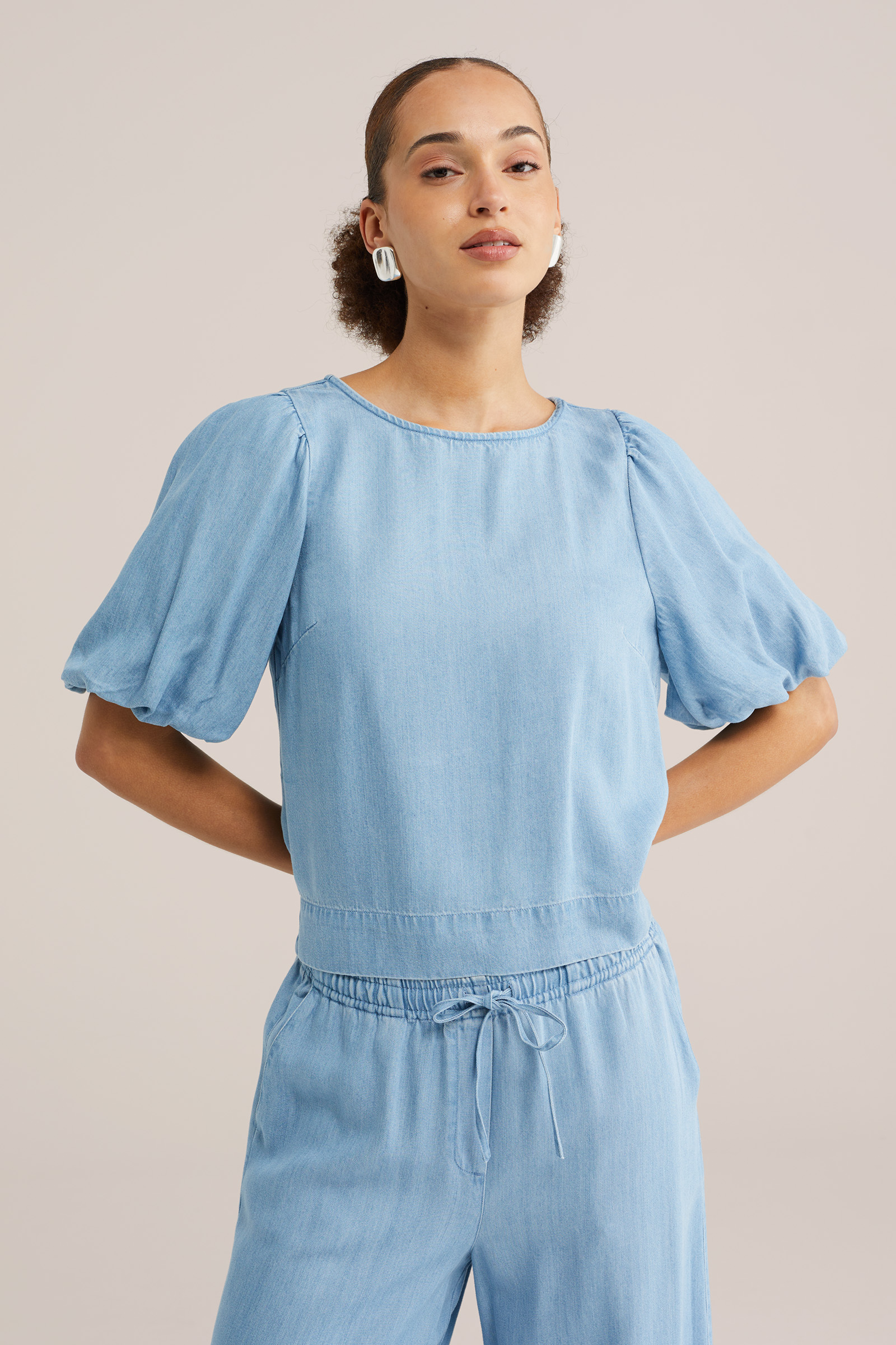 Dames denim blouse met ballonmouwen